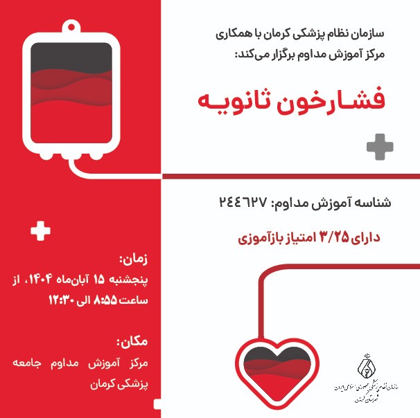 سازمان نظام پزشکی کرمان با همکاری مرکز آموزش مداوم برگزار می‌کند: کنفرانس علمی یک روزه “فشار خون ثانویه” دارای 3.25 امتیاز بازآموزی دبیرعلمی:دکتر فاطمه موسوی مهدی‌آبادی، فوق‌تخصص نفرولوژیدکتر نجمه شمس‌پور، فوق‌تخصص نفرولوژی گروه هدف:پزشک عمومی، پزشکی اجتماعی، و پزشک خانواده شناسه آموزش مداوم: 244627 زمان: پنجشنبه، 15 آبان‌ماه 1404، از ساعت 8:55 الی 12:30 مکان: مرکز آموزش مداوم جامعه پزشکی […]