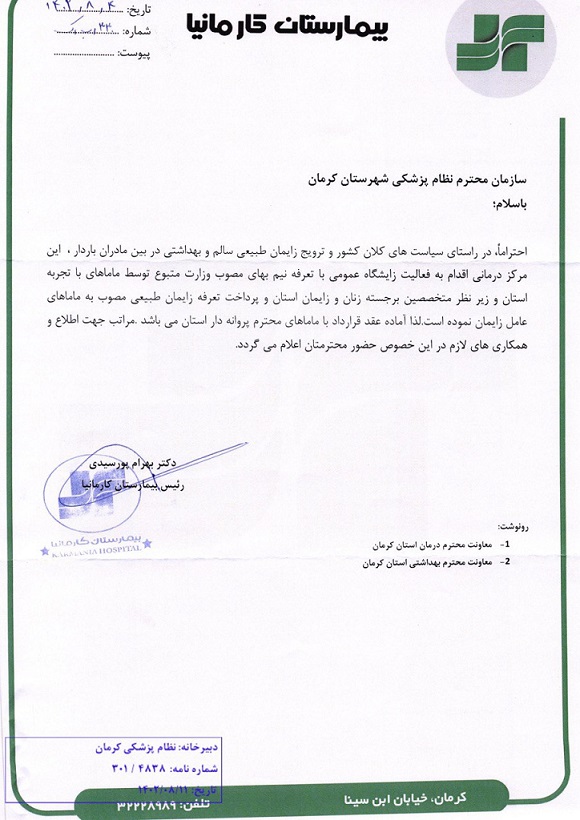 اعلام آمادگی بیمارستان کارمانیا جهت عقد قرارداد با همکاران مامای دارای پروانه در سطح استان کرمان