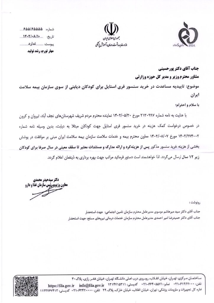 طبق نامه نماینده مردم شهرستان های نجف اباد، تیروان و کرون، در خصوص خرید سنسور فری استایل برای کودکان مبتلا به دیابت، معاون بیمه و خدمات سلامت سازمان بیمه سلامت ایران و معاون وزیر و رئیس سازمان غذا و دارو موافقت خود را مبنی بر پوشش بخشی از هزینه خرید سنسور مذکور پس از هزینه کرد و ارائه مدارک و مستندات معتبر تا سقف معینی در سال صرفا برای کودکان زیر 12 سال، اعلام کردند.