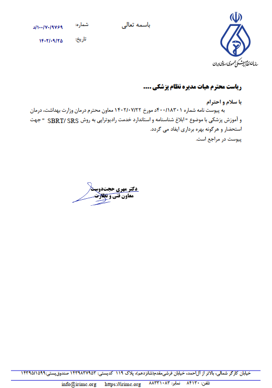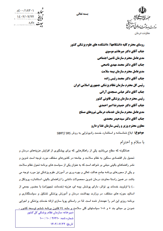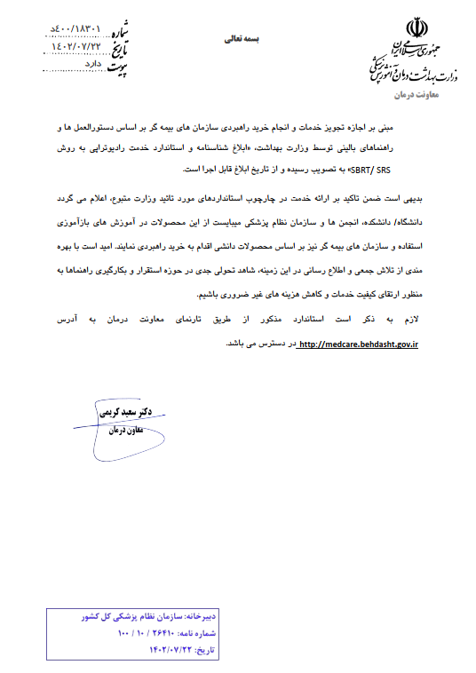 در راستای پویاسازی ارائه خدمات پزشکی و اجرایی نمودن سیاست های کلی سلامت و قانون برنامه ششم توسعه کشور، مبنی بر اجازه تجویز خدمات و انجام خرید راهبردی سازمان های بیمه گر براساس دستورالعمل ها و راهنماهای بالینی توسط وزارت بهداشت «ابلاغ شناسنامه و استاندارد خدمت رادیوتراپی به روش SBRT/SRS» به تصویب رسیده و از تاریخ ابلاغ قابل اجرا است.