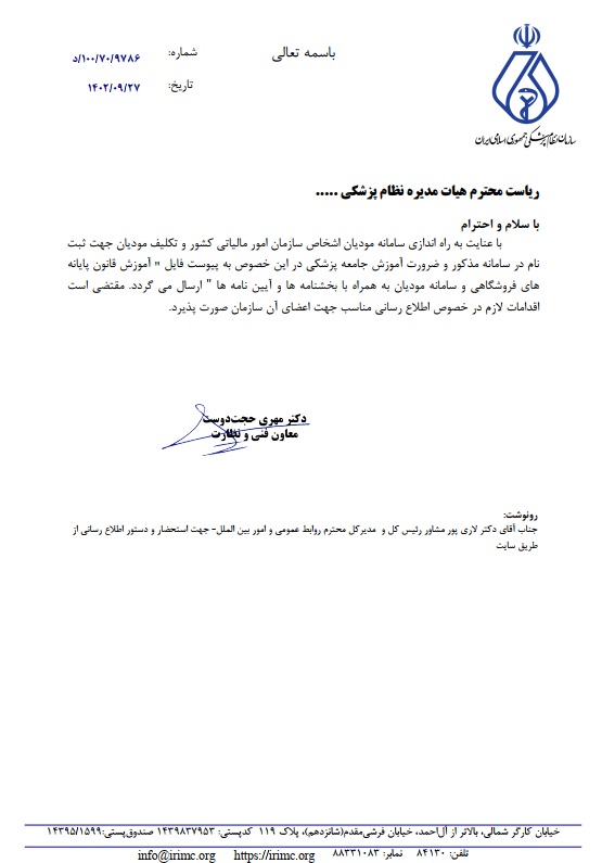 با عنایت به راه اندازی سامانه مودیان اشخاص سازمان امور مالیاتی کشور و تکلیف مودیان جهت ثبت نام در سامانه مذکور و ضرورت آموزش جامعه پزشکی در این خصوص فایل مربوطه در سایت سازمان نظام پزشکی کرمان قابل مشاهده می باشد.