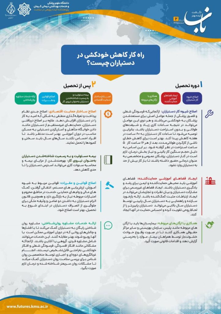 این گزاره‌برگ اطلاعاتی در رابطه با دلایل خودکشی در پزشکان، دلیل افزایش فشار و استرس روانی و فرسودگی در جامعه پزشکی در ایران، بررسی ساعات کاری دستیاران و تاثیر آن بر جوانب مختلف و راهکار کاهش خودکشی در دستیاران را در اختیار  قرار می‌دهد.